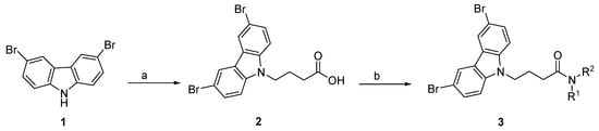 The synthetic method to construct the 3,6-dibromocarbazole derivatives library is described in Scheme 1 (see the Supplementary Materials for representative 1H and 13C NMR spectral data). The N-alkyl-3,6-dibromocarbazole derivatives were generated in a three-step synthesis using 3,6-dibromocarbazole 1 as origin of the carbazole derivatives core. Compound 1 was reacted with ethyl 4-bromobutyrate to introduce the aliphatic side chain by nucleophilic substitution (Scheme 1), followed by hydrolysis to afford the corresponding 3,6-diromocarbazole-4-butyric acid 2. For the generation of 3,6-dibromocarbazole-4-butyramide derivatives 3, compound 2 was therefore used as starting material, which reacted with different amines via an amide coupling reaction using N-(3-Dimethylaminopropyl)-N’-ethylcarbonate (EDAC) with Hydroxybenzotriazole (HOBt) as an additive dissolved in methylene chloride (CH2Cl2).