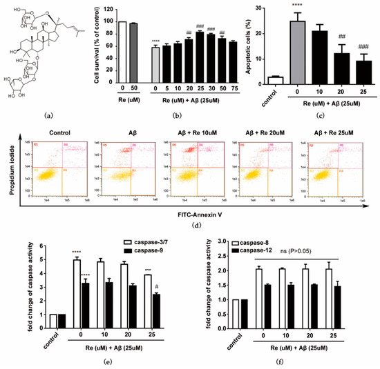 Protective effects of ginsenoside Re against Aβ25–35-induced cell damage. (a) Chemical structure of ginsenoside Re (molecular formula: C48H82O18; molecular weight: 947.12); (b) SH-SY5Y cells were co-treated with ginsenoside Re and Aβ for 24 h. Cell viability was determined by CCK-8 assays. Bar diagrams showing percentage of survival cells; (c) bar diagrams showing percentage of apoptosis; (d) annexin V/FITC-PI staining and flow cytometric analysis of apoptosis; (e) caspase-3/7 and caspase-9 activity were assessed by fluorometric and colorimetric assay, respectively; and (f) caspase-8 and caspase-12 activity were assessed by fluorometric assay. **** p < 0.0001 versus control; # p < 0.05, ## p < 0.01, ### p < 0.001 versus Aβ treatment alone.