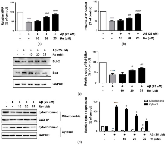Ginsenoside Re alleviated mitochondrial dysfunction and prevents mitochondria mediated apoptotic pathway after Aβ 25–35 exposure in SH-SY5Y cells. (a) The loss of MMP in SH-SY5Y cells; (b) the relative ATP content in SH-SY5Y cells; (c) the protein expression levels of Bcl-2 and Bax in SH-SY5Y cells were detected by western blot analysis; (d) western blot analysis to detect cytochrome c levels in mitochondrial fraction and cytosolic fraction of SH-SY5Y cells. ** p < 0.01, **** p < 0.0001 versus control; # p < 0.05, ## p < 0.01, ### p < 0.001, #### p < 0.0001 versus Aβ treatment alone.