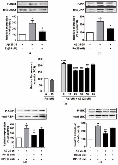 2.3. Ginsenoside Re Inhibited Aβ-induced ASK-1/JNK Activation in a ROS-Dependent Manner