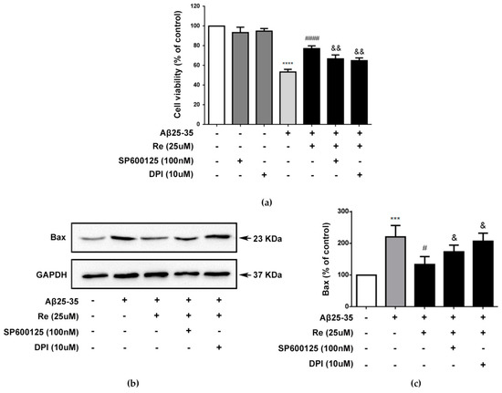 The neuroprotective effect of ginsenoside Re is dependent of ROS-dependent ASK1/JNK signaling pathway. (a) SH-SY5Y cells were pre-incubated with or without 100 nM sp600125 or 10 uM DPI for 50 min and then treated with 25 µM Re and with or without Aβ25–35 for 24 h. Cell viability was detected by CCK-8 assay; (b,c) western blot analysis to detect level of Bax. The band intensity of Bax was quantified by densitometry and normalized to GAPDH. *** p < 0.001, **** p < 0.0001 versus control; # p < 0.05, #### p < 0.0001 versus Aβ treatment alone; & p < 0.05, && p < 0.01 versus the cells treated with Aβ and 25 uM Ginsenoside Re.
