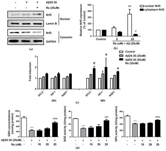 Our results revealed that 25 µM ginsenoside Re treatment markedly increased the level of Nrf2 protein in the nucleus and elicited a concomitant decrease in the cytoplasm (p < 0.01, p < 0.05, Figure 5a,b). Translocation of activated Nrf2 from the cytosol into nuclei induced the transcription of many Nrf2-regulated antioxidant enzymes. The effects of ginsenoside Re on mRNA expression of GCLc, HO-1, and NQO1 were determined, as they are directly linked to the Nrf2-mediated antioxidative defense response. GCLc, HO-1 and NQO1 gene expression was induced 24 h after Aβ administration and remained increased at 48 h post-treatment. Ginsenoside Re treatment further increased this expression. The effect of ginsenoside Re was even greater at 48 h than observed at 24 h in the presence of Aβ (p < 0.05 versus cells treated with Aβ25–35 alone; Figure 5c). Consistently, the content of GSH and activities of SOD and Gpx were significantly increased by ginsenoside Re treatment (p < 0.0001 versus control, p < 0.001, p < 0.0001 versus cells treated with Aβ25–35 alone Figure 5d).