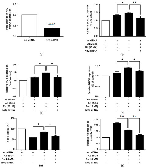 Additionally, we determined the effect of ginsenoside Re on Aβ-induced cell viability and ROS generation in Nrf2-silenced cells. Our results indicated that the cytoprotective effect on cell viability and inhibitory effect on ROS generation of ginsenoside Re were substantially impeded by Nrf2 silencing (Figure 6e,f). Collectively, these results demonstrated that ginsenoside Re-mediated cytoprotection might also be associated with targeting of the Nrf2 pathway.
