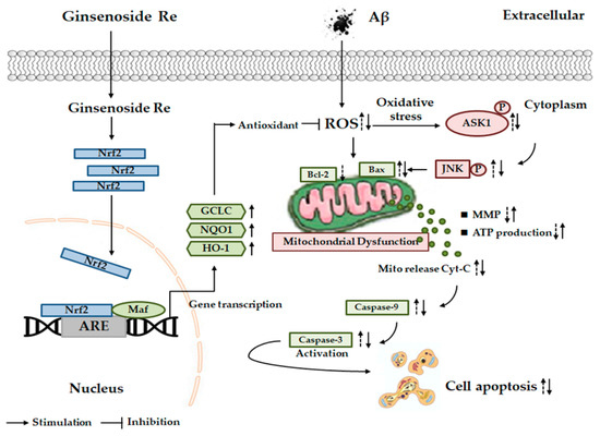 Despite significant efforts to discover a therapeutic strategy to prevent the progression of or cure AD, available therapy is limited to symptomatic treatments whose efficacy remains unsatisfactory at present. The results of the present study demonstrate, for the first time, that ginsenoside Re prevents Aβ-induced mitochondrial-dependent apoptosis in SH-SY5Y cells by increasing their cellular Bcl-2/Bax ratio. The upstream mechanism was associated with attenuation of ROS-dependent proapoptotic Bax upregulation that occurs under apoptotic challenge: Ginsenoside Re inhibited Bax expression in Aβ-challenged SH-SY5Y cells by inhibiting JNK activity via ASK-1 inactivity. Further investigation revealed that this protective effect of ginsenoside Re was associated with activation of Nrf2-antioxidant signaling. Indeed, ginsenoside Re could induce nuclear translocation of Nrf2 to enhance the activities of several antioxidant enzymes.