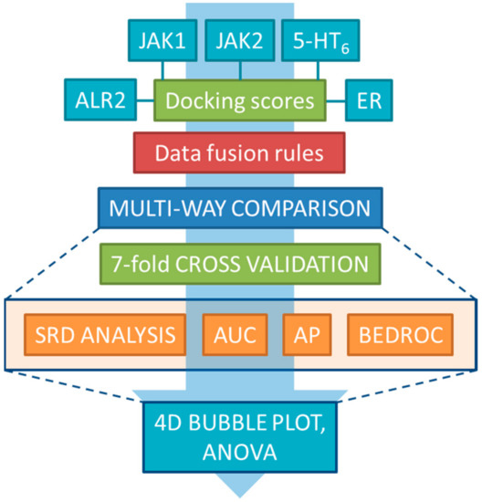 For the statistical comparison of the fusion rules, we have applied several performance metrics, including the area under the ROC curve values (AUC), average precision (AP), Boltzmann-enhanced discrimination of receiver operating characteristic (BEDROC) and sum of ranking differences (SRD)—these are summarized in Section 3.3. The workflow of the project is included in Figure 1.