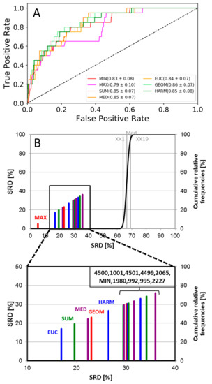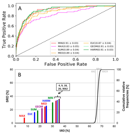 Sum of ranking differences (SRD) can be applied for the comparison of different metrics, models, methods etc., and in our case: the data fusion methods [45,46]. The method is robust, but also sensitive to small differences between the compared variables. By convention, the data matrix contains the comparable variables (data fusion methods) in the columns and the samples (molecules) in the rows. It is crucial that a reference vector is added as the last column of the matrix, which can be a set of known reference values, e.g., from a measurement if available, but we can also use row-wise data fusion (average, minimum or maximum), if an exact reference vector is not available. Data fusion is an inherent, crucial step in SRD analysis. Row-maximums are selected as a gold standard for those magnitudes where the ‘larger the better’ reasoning applies (e.g., for correlation coefficients, accuracy, etc.) and row minimums for those magnitudes where the ‘smaller the better’ applies (RMSE, misclassification errors, etc.) With this approach we can hypothetically define the best method that unites all the advantageous features. Then, the variables—including the reference vector—are rank transformed in increasing magnitude. Then, the absolute differences between the ranks assigned by the reference vector and the other variables are calculated one-by-one, for each sample and each variable. In the final step, these differences are summed for each variable (i.e., column-wise), which gives the SRD values. SRD values represent a Manhattan distance from the reference vector (commonly normalized between 0 and 100); thus, the smaller the better. The concept of SRD is illustrated in more detail in our recent work [47]. SRD has two types of validation protocol: cross-validation and a randomization test. With the randomization test, we can establish whether the ranking produced by a variable/method (here, data fusion rule) is significantly different from assigning ranks randomly, whereas with cross-validation we can test whether the SRD value distributions of two methods (fusion rules) are significantly different. SRD applies special plots, where the column heights do not carry information, but fairly the proximity of the columns to zero and to the frequency distribution curve of random ranking. We have used SRD in our recent works for the comparison of similarity metrics for molecular [47], metabolomic [48] and interaction fingerprints [49].
