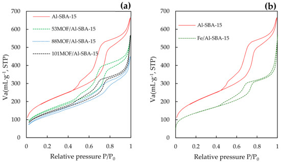Nitrogen adsorption/desorption isotherms of (a) 53MOF/Al-SBA-15, 88MOF/Al-SBA-15 and 101MOF/Al-SBA-15 and (b) Fe/Al-SBA-15.