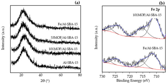 Powder X-ray diffraction pattern of all samples are presented in Figure 2a. Iron incorporation on Al-SBA-15 materials could only be hinted in some materials, e.g., Fe/Al-SBA-15, due to the low amount of iron species on Al-SBA-15 [29]. Although no clear diffraction peaks of iron species could be visualized in XRD patterns, XPS spectra confirmed the presence of iron species by the peaks at 711.5 eV and 725 eV, corresponding to Fe 2p3/2 and Fe 2p1/2, respectively [30]. XPS results supported the presence of Fe3+ (mostly) and a small proportion of Fe2+ species as previously reported [31,32] (Figure 2b).
