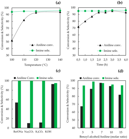 On the different catalysts, 53MOF/Al-SBA-15 provided the best results and was subsequently selected for further optimization. The optimum reaction temperature, time, molar ratio of benzyl alcohol to aniline and basic additive were studied. As seen in Figure 4a, aniline conversion rapidly increased from 52% to 93% at the temperature range of 100-120 °C. However, a further increase to 140 °C provided similar conversions in the systems (93–94%). Hence, the optimum temperature was found to be 120 °C. The effect of reaction time was then investigated, with conversions raising from 72% to 93% and approaching steady state conditions after 2 h (optimum reaction time, Figure 4b).