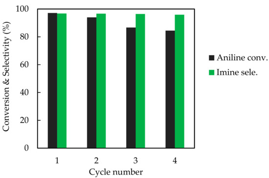 The reusability of the 53MOF/Al-SBA-15 catalyst was eventually studied under optimum reaction conditions. For each recycle, the spent catalyst was recovered from the reaction mixture by filtration, followed by thorough washing and drying at 100 °C for 1 h prior to its reuse in the next run. Results presented in Figure 5 pointed to a rather stable aniline conversion and imine selectivity upon reuses, which further supported the excellent recyclability and stability of the mechanochemically synthesized catalysts in good agreement with previous reports from the group, indicating that 53MOF/Al-SBA-15 could well resist leaching and deactivation of active sites.