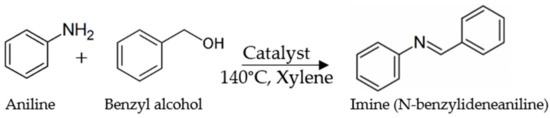 Additionally, studies on the effect of benzyl alcohol to aniline molar ratios were performed and results have been presented in Figure 4d. The molar ratio of benzyl alcohol to aniline played an important role for the reaction. Among all of them, the reaction system containing benzyl alcohol and aniline in a molar ratio of 1:7 provided the best activity, achieving the highest aniline conversion ca. 97%, 96% imine selectivity. Higher benzyl alcohol/aniline ratios (ca. 1:10 and 1:15 molar ratio) led to a slightly decreased aniline conversion due to the formation of benzyl oligomers (detected by gas chromatography-mass spectrometry (GC-MS)) that could be adsorbed on the surface of the catalyst, partially blocking the active sites (fouling). Optimum conditions for aniline alkylation employing the best performing 53MOF/Al-SBA-15 catalyst were found to be 1 mmol aniline (0.092 mL), 7 mmol benzyl alcohol (0.725 mL), xylene (5 mL), catalysts (30 mg), KOH (20 mg), temperature 120 °C and 2 h of reaction time.