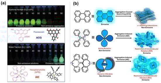(a) Photographs showing the ACQ behaviour of fluorescein and AIE properties of HPS, in the mixture of water-miscible organic solvent and water. Reproduced with permission from [16]. Copyright 2014, John Wiley & Sons, Inc. (b) Schematics showing the general mechanism of ACQ and AIE.