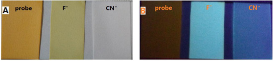 Colour change (A) and emission change (B) changes of A5-coated test strips upon exposure to fluoride and cyanide. Reproduced with permission from [46]. Copyright 2016, Elsevier B. V.