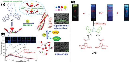 (a) Schematic representing the assembly and disassembly of A11-fluoride supramolecular polymer. (b) Emission spectra and photo showing the response of A11 in the presence of fluoride and other anions. (c) Photos showing the emission colour of supramolecular gels formed between A13 and fluoride and Zn2+. Reproduced with permission from [52,54]. Copyright 2018 and 2016, the Royal Society of Chemistry.
