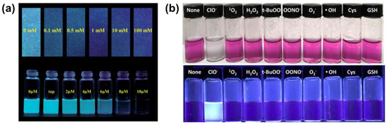 - Gu, J.; Li, X.; Zhou, Z.; Liao, R.; Gao, J.; Tang, Y.; Wang, Q. Synergistic regulation of effective detection for hypochlorite based on a dual-mode probe by employing aggregation induced emission (AIE) and intramolecular charge transfer (ICT) effects. Chem. Eng. J. 2019, 368, 157–164. [Google Scholar] [CrossRef]