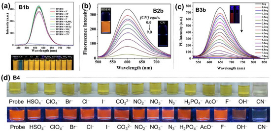 AIE-active chemosensors B1a and B1b formed aggregates in aqueous solution containing CTAB surfactant, exhibiting greenish-yellow and orange emission, respectively. An emission turn-off was observed in the presence of cyanide due to nucleophilic addition of cyanide at the dicyanovinyl groups which resulted in disaggregation (Figure 6a) [73]. Similarly, the yellowish orange and orange fluorescence arising from the aggregation of chemosensors B2a and B2b was quenched in the presence of cyanide due to the same principle described above (Figure 6b) [74]. AIE-active dicyanovinyl-triphenylamine based chemosensor B3a was reported to detect both cyanide and sulphite anions with a detection limit of 9.88 nM and 0.107 μM, respectively, in aqueous media [75]. On the other hand, addition of two pendant arms carrying thymine groups to dicyanovinyl-triphenylamine allowed derivative B3b to detect Hg2+ via an observable turn-on of red emission in addition to cyanide detection, which exhibited the opposite quenching of red-emission (Figure 6c) [76]. Also reported was the full quenching of orange emission of B4 aggregates in aqueous solution in the presence of cyanide due to the formation of aqueous soluble cyanated species, leading to disaggregation of the AIE-active compound (Figure 6d) [77]. In general, this sensing mechanism combining nucleophilic attack of cyanide and a change in aqueous-solubility of the cyanated species allows for sensitive detection of cyanide in aqueous medium, and hence is applicable to cyanide sensing of water sources where contamination may be an issue in some parts of the world.