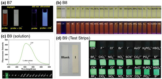 (a) Photos showing colour and fluorescence change of B7 in water before and after addition of cyanide. Reproduced with permission from [80]. Copyright 2016, the Royal Society of Chemistry. (b) Photos showing the selective decolourisation and emission-quenching of B8 in aqueous solution by cyanide. Reproduced with permission from [81]. Copyright 2019, Elsevier B. V. (c) Photoluminescence spectra and photos of B9 in the presence of different anions. (d) Photos showing the colour of B9-coated test papers, and its emission test papers after exposure to various anions in the absence (above) and presence (below) of cyanide. Reproduced with permission from [82]. Copyright 2017, the Royal Society of Chemistry.