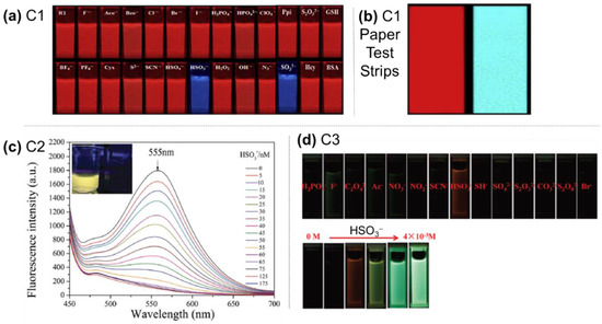(a) Photos showing the selective emission colour change of C1 solution due to HSO3− and SO32−. (b) Photos showing emission change of C1-coated paper test strips on exposure to HSO3−. Reproduced with permission from [89]. Copyright 2016, Elsevier B. V. (c) Spectrofluorometric titration of C2 with HSO3− with photos showing the quenching of yellow emission upon exposure to the anion. Reproduced with permission from [90]. Copyright 2018, the Royal Society of Chemistry. (d) Photos showing the selective turn-on of red emission of C3 in the presence of low amount of HSO3− and the emission change of C3 solution on increasing amount of HSO3− added. Reproduced with permission from [91]. Copyright 2019, the Royal Society of Chemistry.