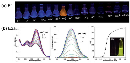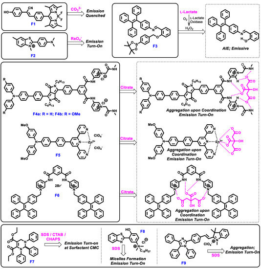 Anions play important biological roles in our body. Anions also exist at large in our environment, some of which are extremely harmful to our body. It will thus be vital to detect these anions in our surrounding environment, particularly harmful ones, to safeguard our health and safety. There has been extensive research over the decades in the development of anion fluorescent and colorimetric probes for easy and rapid sensing of anions [5,37,38,39]. In general, several characteristics of anions need to be considered in the development of fluorescent probes: (1) nucleophilicity, (2) basicity, and (3) sites available for coordination or supramolecular interactions. To begin with, some anions are highly nucleophilic and hence reactive towards electron-deficient functional groups. Fluorescent probes for selective detection of such anions often encompass reactive groups, which enable rendering of a change in optical and emission properties upon nucleophilic reaction with anions of interest. On the other hand, some anions preferentially act as a base and are possible to extract off acidic protons from fluorescent sensors, which may render changes in solubility or lead to further chemical reactions. Finally, some anions are able to act as mono- or multivalent ligands that coordinate with metal centres to readily form hydrogen bonds or engage in other forms of supramolecular interactions like anion-π and host-guest interactions, which can be taken into consideration in the development of fluorescent probes for selective detection of anions.