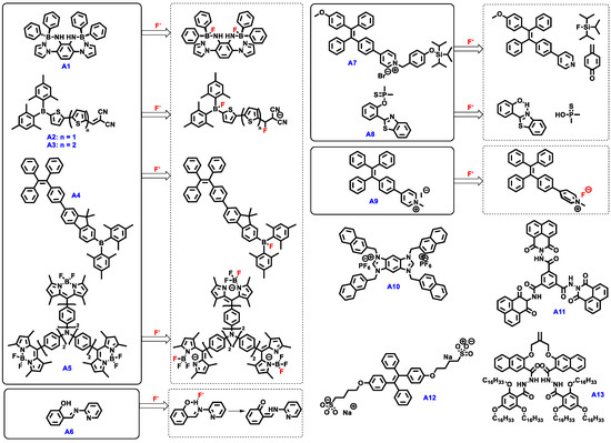 Chemical structures of AIE-based fluoride chemosensors (A1–A13) with selected sensing mechanisms shown.