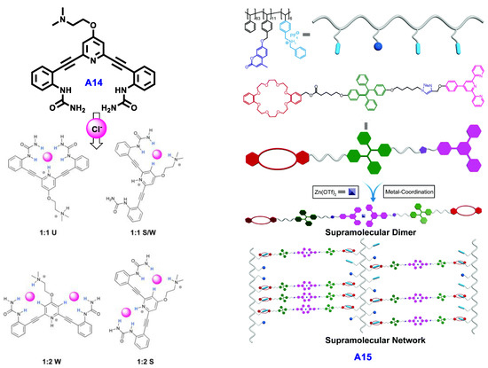 Pyridine biurea ligand A14, when protonated at pyridine’s nitrogen under acidic conditions, was found to selectively coordinate chloride in water. Coordination of chloride resulted in an AIE-active complex that aggregated in water, turning on bright green emission [58]. The intensity of turn-on emission caused by chloride was significantly greater than that caused by perchlorate and fluoride. Four modes of coordination between protonated A14 and chloride were proposed as shown in Scheme 2.