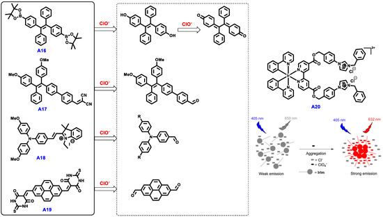 Chemical structures of AIE-based hypochlorite chemosensors (A16–A19) and perchlorate chemosensor A20, with their respective sensing mechanisms.
