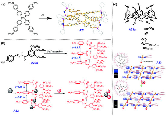 Zhang et al. reported a silver–phosphine tetragonal cage, A21, formed by the coordination of Ag+ with a TPE-based tetradentate phosphine ligand, which emitted bright green luminescence both in solution and solid state due to RIR mechanism of the TPE moiety [66]. Ionic interaction between iodide and Ag+ centres, however, resulted in the quenching of this emission, making A21 a promising candidate for iodide chemosensing. Two iodide-responsive supramolecular organogel systems, A22 and A23, were separately reported by Wei et al. The organogelator A22a (Scheme 4b) could self-assemble with Pb2+ to form organogel A22, which exhibited blue fluorescence. Treatment of A22 with iodide ions can reversibly switch off the fluorescence under gel–gel state by competitively binding with Pb2+ leading to changes in interlamellar supramolecular interactions between A22 and a reduction of π-π stacking distance [67]. Similarly, pillar [5]arene-based organogelator A23a can self-assemble into stable organogel A23 via a series of supramolecular interactions, including hydrogen bonding and host–guest interactions (Scheme 4c), which exhibited blue fluorescence [68]. Treatment with iodide in the gel–gel state disrupted hydrogen bonding and hence assembly of gel A23, leading to an 80% decrease in fluorescence intensity. The detection limits of A22 and A23 were determined to be 0.1 μM and 94 nM, respectively, and their iodide-responsive capabilities make them useful as potential fluorescent security display materials [67,68].