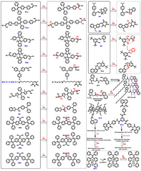 Pseudohalides are anions in that their chemistry and reactivity resemble that of halides. Amongst the pseudohalides, sensing of cyanides receives the most attention due to its high toxicity. The lethal dose of cyanide to human beings is 1.5 mg/kg of body weight and unfortunately, cyanide contamination in the environment remains a real threat, particularly in the mining industries. To date, a large number of novel colorimetric and fluorescence cyanide chemosensors have been developed [69,70,71,72]. The common mechanisms for cyanide sensing involve either coordination of cyanide anions, or chemical reaction with cyanide nucleophile. These strategies are also evident in numerous examples of AIE-based cyanide chemosensors discussed in this section. The chemical structures and general mechanism of the fluorescent chemosensors B1a–B14 are given in Scheme 5, and their optical properties and sensing performances are summarized in Table 5.