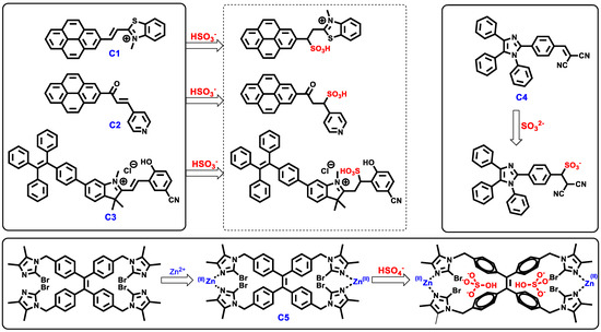 Chemical structures of AIE-based bisulphite, sulphite and bisulphate chemosensors C1–C5, and their general sensing mechanisms.