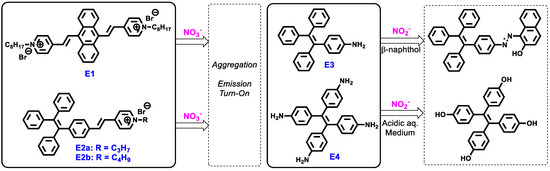- Chatterjee, A.; Khandare, D.G.; Saini, P.; Chattopadhyay, A.; Majik, M.S.; Banerjee, M. Amine functionalized tetraphenylethylene: A novel aggregation-induced emission based fluorescent chemodosimeter for nitrite and nitrate ions. RSC Adv. 2015, 5, 31479–31484. [Google Scholar] [CrossRef]