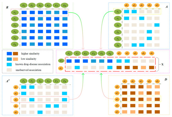 The probability that a drug is associated with a disease is higher when there are more drugs similar to another drug associated with a disease, such as and . As shown in Figure 2, drugs similar to are {}, and the drugs associated with are {}. The drugs associated with are similar to , and therefore, the probability of being associated with is very high. The first row of matrix R denotes the similarity between and all drugs, and the third row of the matrix denotes as the associations between and all drugs.