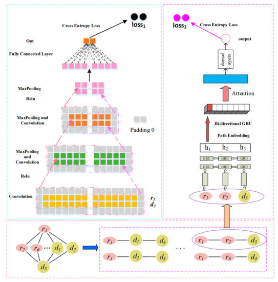 Most advanced methods are predictive for drug–disease networks. Liang et al. [23] used drug chemical substructure information, drug target domain information, and drug target annotation information to calculate drug similarities; the drug-disease associations were predicted through Laplacian regularized sparse subspace learning (LRSSL). Luo et al. [24] used drug chemical substructure information to calculate drug similarities, and they used disease semantics to calculate disease similarities. Then, they constructed a drug-disease two-layer heterogeneous network using a bi-random walk with a restart algorithm to reposition drugs. Zhang et al. [25] also used drug similarity and disease similarity to design drug–disease heterogeneous networks for repositioning drugs based on matrix decomposition with similarity constraints. Xuan et al. [26] proposed a matrix-based decomposition method for integrating drug similarity and disease similarity to predict drug–disease associations. However, these methods are shallow learning methods that cannot accommodate complex and non-linear information on drug similarity, disease similarity, and drug–disease associations. In addition, the paths of drugs and diseases as important auxiliary information were not deeply integrated in these previous methods. Therefore, a deep-learning-based prediction method must be developed to integrate the similarity, association information, and path information of drug–disease pairs. We propose a prediction method based on a convolutional neural network (CNN) and gated recurrent unit (GRU) called CGARDP for predicting drug-disease associations. The left part of CGARDP’s prediction model focuses on local information related to a drug-disease pair, and the right part of the model learns the path information between drug-disease pairs. Experimental cross-validation results clearly show that CGARDP performs better than several of the most advanced prediction methods. Case studies involving five drugs show that CGARDP can detect potential candidate disease indications.