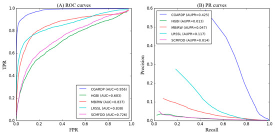 where TP indicates the correct identification of the number of positive samples, TN indicates the correct identification of the number of negative samples, FP indicates the number of samples that will be predicted as a positive example, and FN indicates the number of samples identified as a negative sample. Thus, the receiver operating characteristic (ROC) curve [36] can be drawn using different TPRs and FPRs under different θ. The area under the curve (AUC) is called the drug-related AUC value. The average AUC of all drugs was used to assess the overall performance of our method. Because the ratio of positive and negative samples is 1:169, there is a large class imbalance. The class imbalance problem is concerned with positive cases, while the two indicators of the PR curve are focused on positive samples; therefore, the PR curve has more credibility than the ROC curve [1]. Thus, we used the PR curve to measure the performance at the same time. Precision is defined as the percentage of real samples that are determined as positive samples, and recall as the percentage of true samples to the total number of actual positive samples.