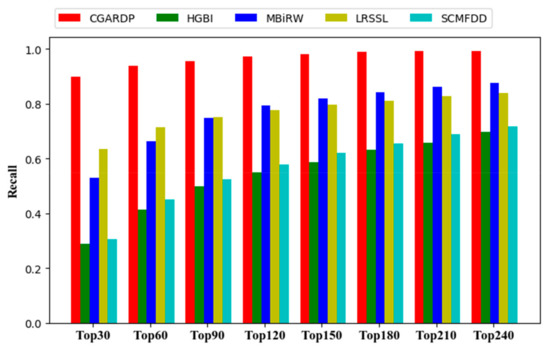 In addition, biologists always choose to arrange higher-ranking candidate diseases for biological verifications, and therefore, the top of the ranking candidate list must have more positive samples. Therefore, we made another evaluation criterion a performance metric, i.e., we calculated the average recall rate of top-k (k = 30, 60, 90, 120…). The higher the recall rate, the higher is the proportion of drug-related diseases that are correctly retrieved; further, the better the predictive performance, the higher is the positive sample that is successfully identified.