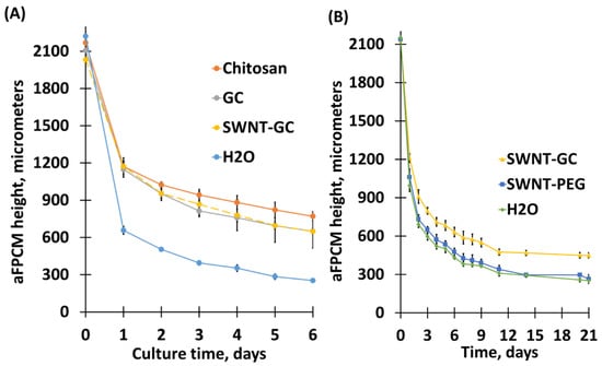 (A) Chitosan (C) derivatives reduced compaction of aFPCM over a 6-day period. Cells were cast in aFPCM incorporated with either water, C, GC, or SWNT-GC. Compaction was measured once daily for 6 days. The control (H2O) means were significantly different (SD) (p < 0.05) than C and GC means at days 1–7. (B) SWNT-PEG did not reduce compaction of aFCPM. The control means were SD than SWNT-GC means at days 1–7. SWNT-PEG means were SD than control means only for days 3, 4, and 6. Additional experiments with other cell types demonstrated similar results.