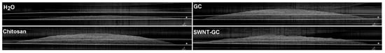 We used the stress-relaxed collagen matrix model [,], combining the anchored and relaxed collagen matrices, to quantify the mechanical contraction process and study interactions between cells, their ECM, and contractile elements []. Results of the matrix height measurements provided supporting and predictive data for the subsequent study of fibroblast-mediated contraction and myofibroblast differentiation []. We demonstrated that chitosan-, GC-, and SWNT-GC aFPCM were unable to compact to the same extent as control (water) and SWNT-PEG (SWNT-only) aFPCM across all tested cell lines. This suggested that tension generation was inhibited. OCT imaging was used to determine the morphological structure and surface shape of aFPCM on the day of maximum tension; this data confirmed the light microscopy compaction measurements. Replicate aFPCM were released to measure tension generation, defined as diameter contraction. From Figure 4, measurements of chitosan derivative-containing released aFPCM across different cell lines showed they had a larger diameter compared to control. Therefore, the larger diameter indicates a decrease in contraction or tension generated within the aFPCM. Since our results showed contraction increased as aFPCM height was reduced, our study further confirmed the correlation between compaction and contraction []. The OCT system we used was only able to visualize aFPCM after 3 days of compaction when the matrix thickness came within the 1.5 mm depth of field; we developed a reduced volume method to allow us to visualize the cell-free matrices immediately after polymerization (Figure 3). Experiments are underway using this modified protocol to observe early timepoints when cells are becoming accustomed to their newly-synthesized environment [].