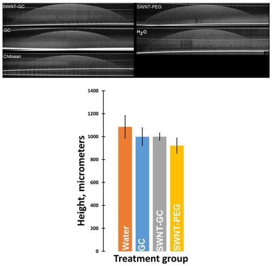 Cell-free matrices with chitosan derivatives demonstrated similar size to water control matrices when viewed with OCT. (Top) Matrices were plated using a reduced volume so that the entire height was visible within the depth constraints of the OCT imager. Tissues were imaged 48 h after plating. All matrices were of similar size. (Bottom) Bar graph showing the average height of samples after 48 h of culture. Only SWNT-PEG means were SD from control means.