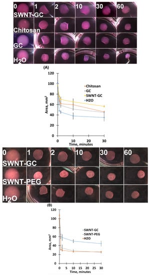 (A) Chitosan derivative-containing aFPCM exhibited less contraction compared to controls. Images of aFPCM diameter captured by camera and software showed that chitosan derivative-containing aFPCM, while anchored, had the same diameter as control aFPCM (top, left images), however once released, exhibited a larger diameter (reduced contraction) than control at the measured timepoints. Control means were SD than C and SWNT-GC means for 1-60 min. GC means were SD than control means only at 1, 10, and 60 min. (B) SWNT-PEG- but not SWNT-GC-incorporated aFPCM contracted similar to controls. Control means were SD than SWNT-GC means for 1–60 min. SWNT-PEG means were only SD from control means at 0 min. Sample images (top) used to calculate released matrix area changes over the times listed. Data were collected at 0, 1, 2, 10, and 30 min after release from the substratum. 60-min measurement was similar to 30-min measurement (not shown). Additional experiments with other cell types demonstrated similar results.