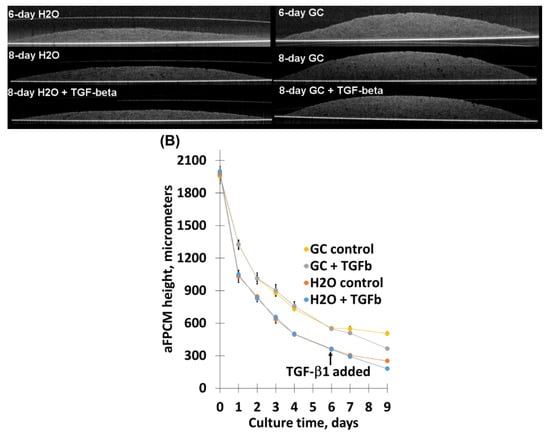 Transforming growth factor beta-1 (TGF-β1) increased compaction in control and chitosan derivative-incorporated aFPCM. Matrices were allowed to approach maximum compaction on day 6, at which time replicate matrices were divided into control and TGF-β1 (5ng/mL)-treated samples. Compaction was measured for 3 days post-treatment. (A) OCT showed the TGF-β1-increased compaction in H2O-treated (left images) and GC (right images). (B) Graphed compaction averages of both H2O and GC aFPCM measured by light microscopy. Note that for each of the measured timepoints, GC compaction < H2O. The control means were SD than the TGF-β1-treated control means at days 7 and 9. There was no SD between GC control means and TGF-β1-treated GC means, except at day 9. Other chitosan derivatives demonstrated similar compaction changes with TGF-β1 across all tested cell types.