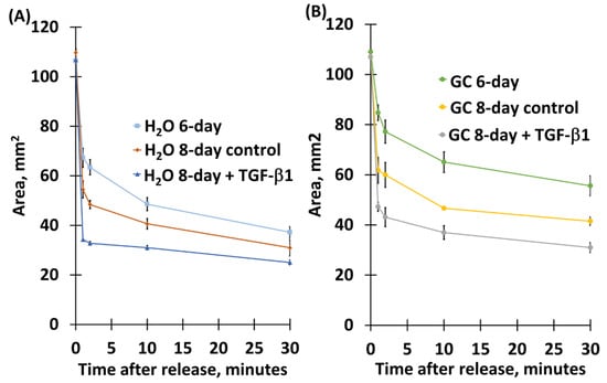 TGF-β1 increased anchorage-released matrix contraction in control and chitosan derivative-incorporated aFPCM. Matrices from each treatment were released and measured at the 6-day timepoint when tension generation was approaching maximum (A,B) (top line). Remaining matrices were divided into +/- TGF-β1-treatment (5ng/nL) and released and measured 2 or 3 days later. In both H2O and GC matrices, 8-day contraction (A,B) (middle line) was greater than 6-day contraction, and TGF-β1 treated matrices demonstrated the greatest contraction (A,B) (bottom line). Note that for each of the measured timepoints, GC contraction < H2O. The means for the 3 H2O groups were SD from each other at 1–30 min, with the exception of the 6-day and 8-day means at 30 min. The means for the 3 GC groups were SD from each other at 1–30 min.