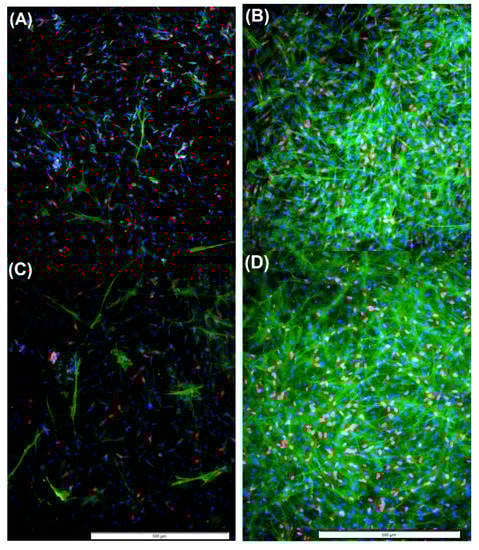 To investigate GC mechanisms of inhibiting compaction and contraction, a myofibroblast proliferative assay was performed. Because myofibroblasts play a crucial role in wound contraction, it is likely that the increase in proliferation and differentiation of myofibroblasts correspond to the amount of tension generated within the aFPCM [,,]. Alpha-smooth muscle actin is the protein expressed by differentiated myofibroblasts, which we identified within green cytoplasmic stress fibers of stained tissues; both the protein’s presence and its incorporation into stress fibers is a requirement of myofibroblasts []. Previously, we found that GC-containing aFPCM exhibited a reduced number of myofibroblasts in a single tested culture []. In the current study we were unable to make a similar observation using different cells (compare Figure 7A to Figure 7C); however, the other cell types tested had a low percentage of myofibroblasts under control conditions relative to the cells previously reported. Other investigators showed a correlation between the intrinsic-stimulated myofibroblast and its increased contractility []; a more-robust study using myofibroblasts with higher intrinsic alpha-smooth muscle actin staining characteristics is warranted.