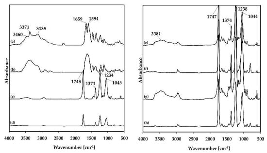 FTIR spectra of (a) pristine SP, (b) processed SP, (c) pristine TAβCD, (d) processed TAβCD, (e) SP1/TAβCD1 PM, (f) SP1/TAβCD1 SD, (g) SP1/TAβCD2 PM, (h) SP1/TAβCD2 SD.