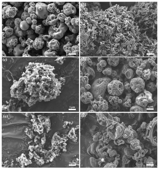 HR-SEM micrographs of (a) processed TAβCD, (b) processed SP, (c) SP1/TAβCD1 PM, (d) spray-dried SP1/TAβCD1 complex, (e) SP1/TAβCD2 PM, and (f) spray-dried SP1/TAβCD2 complex.