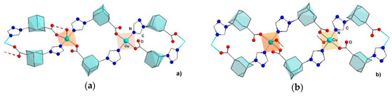 The non-isostructural complexes 1–3 are 1D coordination polymers revealing the bridging nature of the trzadc– ligand (Figure 2 and Figure 3). It coordinates to the metals via one N of triazole and one O atom of carboxyl moiety to form 1D chains. Two trzadc– are arranged between adjacent central atoms; thus, the ligands occupy four coordination sites of the metal forming a square environment. Other sites are occupied by water or methanol: two molecules in the complex 2, revealing octahedral coordination environment of Ni, and one molecule in 3 with a square pyramidal arrangement of Cu. Compound 1 contains the first Cu atom in a square planar environment (without solvent molecules), while the second Cu atom features partially occupied (of 70%) water molecules in a coordination shell according to analysis of residual electron density map (Figure S14). Thus, this Cu atom has a mixed square pyramidal/square planar environment. The reason for partial occupancy of water can be corresponding with the bond distance Cu–O of 2.40 Å, being longer than typical Cu–OH2 bonds (of 1.95–2.20 Å) found in CSDB (v. 5.40, February 2019). As a result, the weak Cu–O interaction leads to defects in the crystal packing. Note that structure 1 contains partially occupied (of 30%) solvate water molecule close to coordinated one. However, they do not compete for the formation of hydrogen bonds (Figure S1a), and there is enough space in the structure for their joint presence.