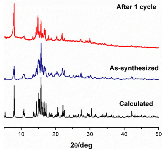 To elucidate the possibility of the homogenous catalysis happening and to prove our claim for the recyclability of the catalyst, we recovered the compound after running a reaction in a single cycle and run PXRD on the recovered sample (Figure 4). The sample was washed with methanol and dried on air prior to analysis.