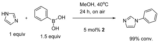 We found that compound 2 serves as an efficient catalyst for the CEL arylation reaction, with imidazole and phenylboronic acid as model substrates (Scheme 2). The reaction was performed at 40° using methanol as a solvent on air with 1:1.5 molar ratio of reagents adding 5 mol% of the catalyst. With these conditions, we achieved 99% conversion (GC) of the starting imidazole after 24 h.