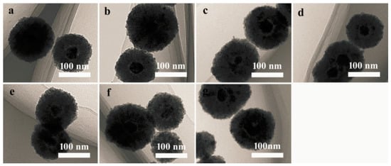 TEM images of Ag@Cu2O (a) and Ag@Cu2O–Pt with Pt precursor concentrations of 0.95 × 10−4 (b), 1.26 × 10−4 (c), 1.43 × 10−4 (d), 1.52 × 10−4 (e), 1.58 × 10−4 (f), and 1.63 × 10−4 (g) mol/L.