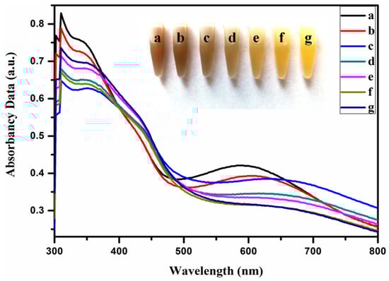 Visual color change upon the addition of increasing concentrations of HPtCl6 to Ag@Cu2O and the corresponding absorbance spectra: 0 (a), 0.95 × 10−4 (b), 1.26 × 10−4 (c), 1.43 × 10−4 (d), 1.52 × 10−4 (e), 1.58 × 10−4 (f), and 1.63 × 10×4 (g) mol/L.
