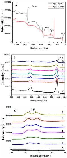 XPS spectra: (A) Survey spectra of Ag@Cu2O and Ag@Cu2O–Pt (prepared using a Pt precursor concentration of 1.58 × 10−4 M). (B) Cu 2p peak regions of Ag@Cu2O (a) and Ag@Cu2O–Pt (b–g) prepared with various concentrations of the Pt precursor (b: 0.95 × 10−4, c: 1.26 × 10−4, d: 1.43 × 10−4, e: 1.52 × 10−4, f: 1.58 × 10−4, and g: 1.63 × 10−4 mol/L). (C) Pt 4f peak regions of Ag@Cu2O (a) and Ag@Cu2O–Pt (b–g) (b: 0.95 × 10−4, c: 1.26 × 10−4, d: 1.43 × 10−4, e: 1.52 × 10−4, f: 1.58 × 10−4, and g: 1.63 × 10−4 mol/L).