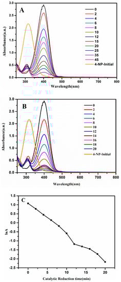 UV-Vis absorption spectra of the reduction of 4-nitrophenol (4-NP) by NaBH4 in the presence of (A) Ag@Cu2O (t = 45 min) and (B) Ag@Cu2O-Pt (t = 20 min). (C) The logarithm of the absorbance at 400 nm vs. the catalytic reduction time.